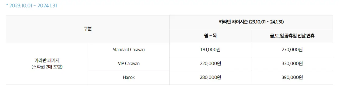 만약, 1박2일 일정으로 즐기실려면 카라반&한옥을 이용하시는게 더 저렴합니다. 숙박을 이용하면 스파권 2매를 제공해 줍니다.