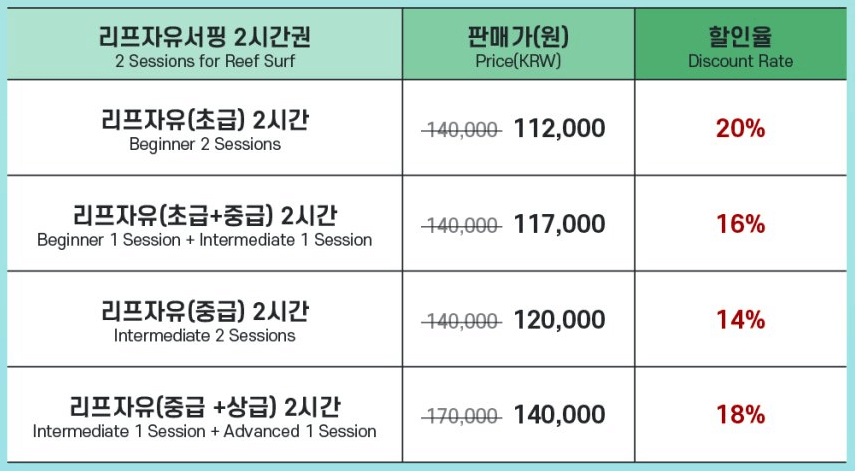 1세션으로 아쉬운 서퍼들을 위한 할인 이벤트로 2 세션을 즐길 수 있습니다.