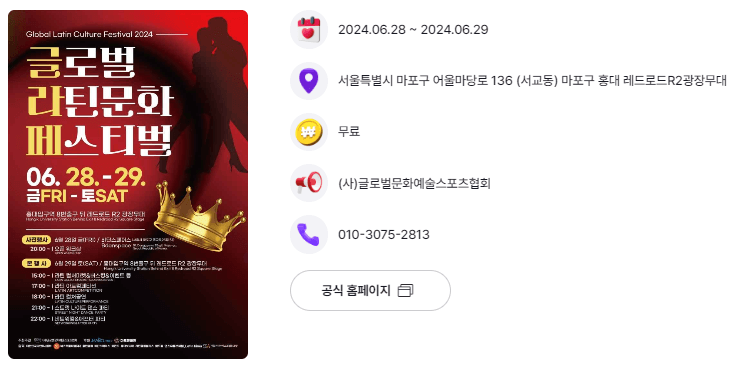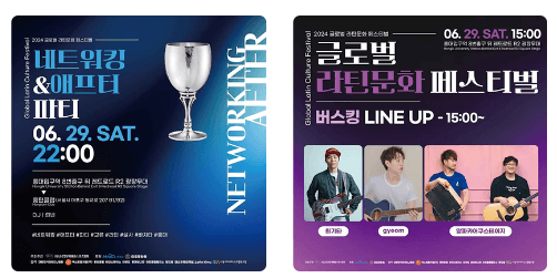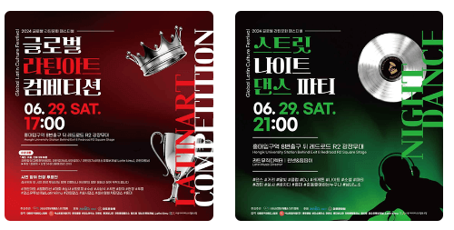 - 본행사 : 2024. 6. 29(토) 15:00~22:00 - 라틴 컬처마켓&버스킹&이벤트 / 라틴 아트컴페티션 / 라틴 컬처공연 / 스트릿 나이트 댄스파티 / 네트워킹&애프터 파티 등
