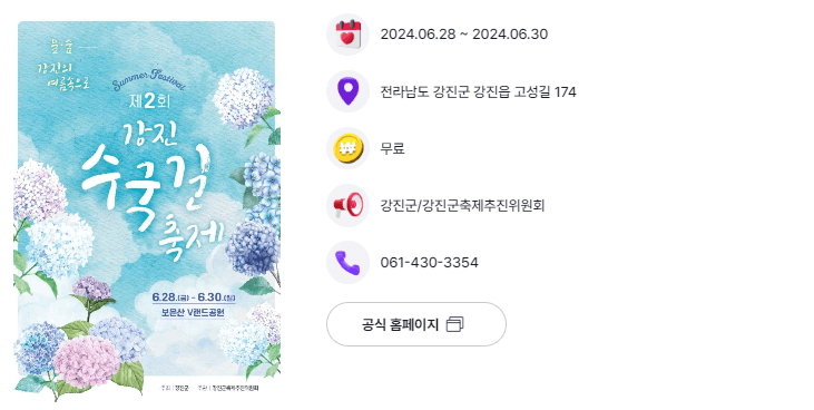 화훼농가로부터 무상 기증받아 구성된 강진읍 고성사, 금곡사, 보은산 등산로를 중심으로 총 8㎞에 달하는 수국 꽃길을 관광 상품화하고 지역 브랜드를 콘텐츠화하여 지역경제와 직결되는 축제입니다.