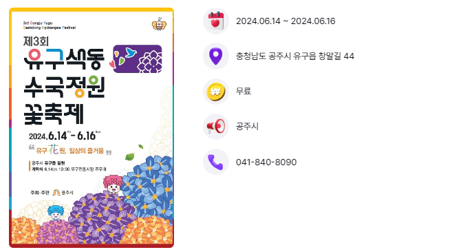 중부권 최대 수국 명소인 유구 색동수국정원에서 2024년 6월 14일 ~ 6월 16일 3일간 유구花원 일상의 즐거움이라는 주제로 유구 색동수국정원 꽃축제가 개최됩니다.