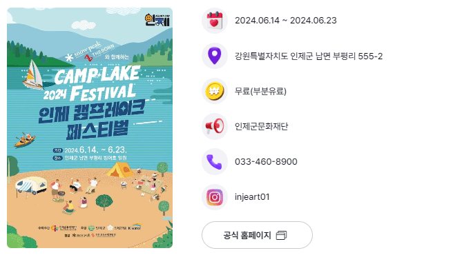 인제캠프레이크페스티벌은 인제 소양호 수변 감성캠핑장을 중심으로 수상레저기구 체험, 몸 들썩 워터풀원더풀・버스킹 공연, 다이내믹 워터슬라이드, 오감만족 다양한 체험프로그램・이벤트 행사, 인제만의 특별한 먹거리 장터와 농특산물 판매장 등의 다양한 프로그램들로 구성되어 있습니다. 입장료는 무료이며 캠핑존 및 일부 체험프로그램은 유료로 운영하고 있습니다.