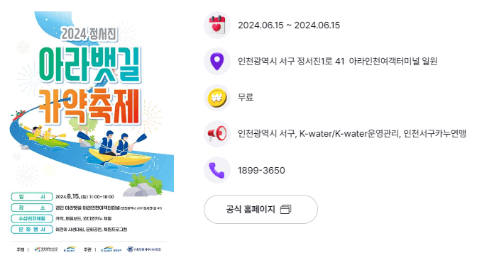 서구 대표 관광지인 정서진 아라뱃길에서 남녀노소 안전하게 즐기는 카약, 패들보드, 인디언카누 등의 수상레저체험과 어린이 사생대회, 문화공연, 체험프로그램 등의 다양한 문화행사가 진행되는 축제입니다.