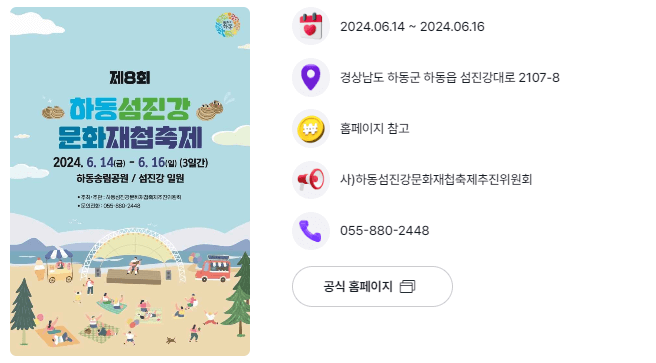 2015년부터 개최된 하동섬진강문화재첩축제는 섬진강의 문화, 하동재첩, 축제를 결합한 여름 축제로 매년 7~8월경 하동 송림공원과 섬진강변에서 개최됐는데, 올해는 일찍 개최되네요.